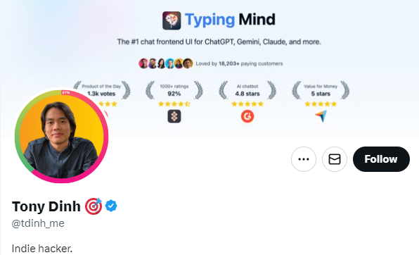 현재 가장 많이 수익을 내고 있는 그의 4번째 앱은 Typing Mind로 Chat gpt 사용자를 위한 UI를 만들었다. 수익은 월 3만 달러가량 매출을 내었다.