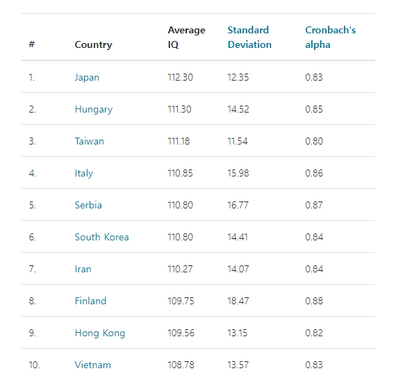 2024년 전세계 지능지수를 평가한 결과 세계 10위 내 아시아 국가가 7개 국가가 차지했다. 일본이 평균지능지수 112.3로 가장 높은 결과가 나왔으며 그 뒤로 헝가리가 111.3으로 2위, 대만과 이탈리아가 각각 3위, 4위를 차지하였다.