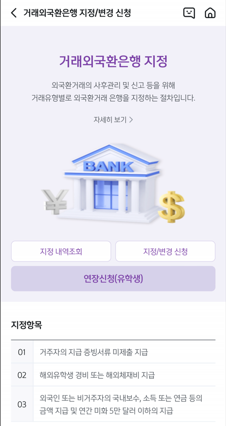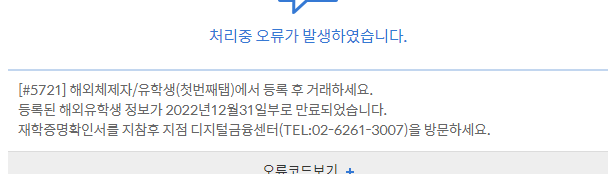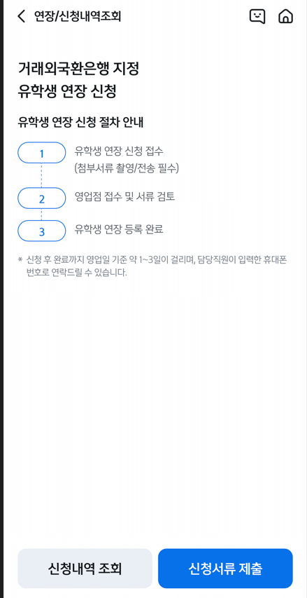 오류 메시지에서는 재학증명서를 지참 후 디지털금융센터(국내)로 방문하라고 되어있습니다. 해외에 있는데 방문은 물론 어려우니 아래 방법을 소개합니다. 유학생의 경우 신한은행(SOL) 어플에 접속하시고 거래 외국환은행 지정에서 연장신청 버튼을 누릅니다. 그리고 관련 서류를 준비하여 어플에서 실행되는 카메라도 찍습니다. (화면캡쳐본이나 사진파일은 처리가 안된다고 적혀있습니다) 관련서류(직전학기 성적서, 등록금 고지서 및 등록금 납입증명서, 재학증명서) 중 1개만 제출하면 됩니다.