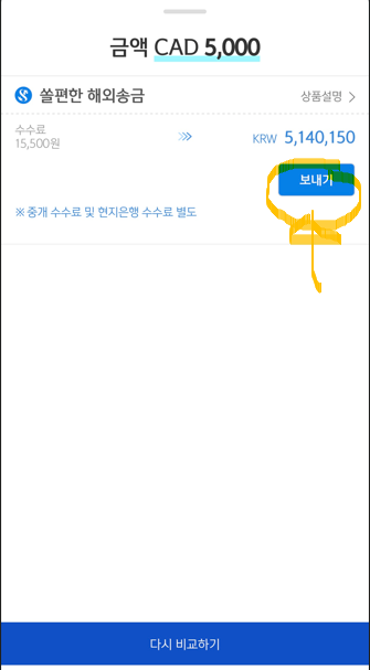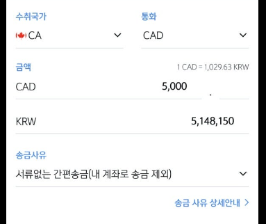 (쏠 편한 해외송금, 5,000 CAD 송금에 수수료 15,500원)