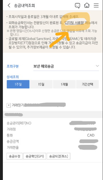 전체메뉴 - 외환 - 내역조회로 들어가면 상단에 디지털 서류함 선택합니다.