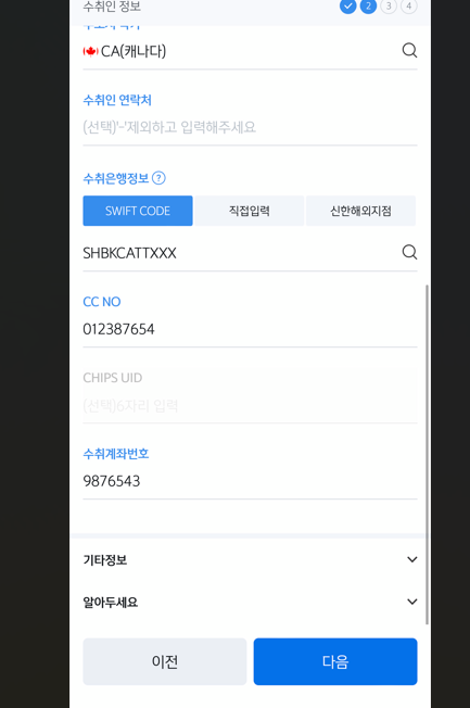 6. 받는 사람 정보 그리고 SWIFT CODE 코드 검증, 해외은행구분, 해외 은행 번호 입력