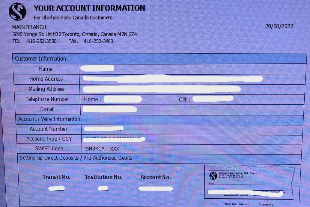 ① SWIFT CODE : SHBKCATTXXX (캐나다 신한은행 지점)