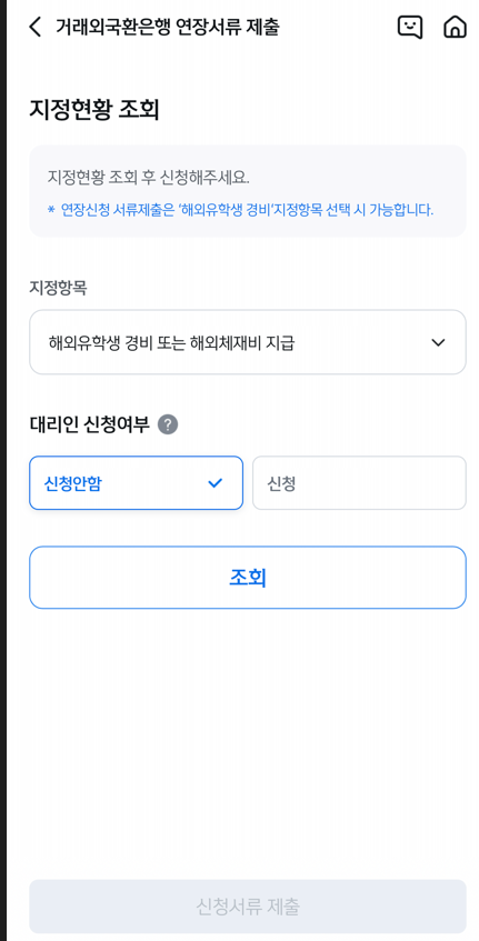 오류 메시지에서는 재학증명서를 지참 후 디지털금융센터(국내)로 방문하라고 되어있습니다. 해외에 있는데 방문은 물론 어려우니 아래 방법을 소개합니다. 유학생의 경우 신한은행(SOL) 어플에 접속하시고 거래 외국환은행 지정에서 연장신청 버튼을 누릅니다. 그리고 관련 서류를 준비하여 어플에서 실행되는 카메라도 찍습니다. (화면캡쳐본이나 사진파일은 처리가 안된다고 적혀있습니다) 관련서류(직전학기 성적서, 등록금 고지서 및 등록금 납입증명서, 재학증명서) 중 1개만 제출하면 됩니다.