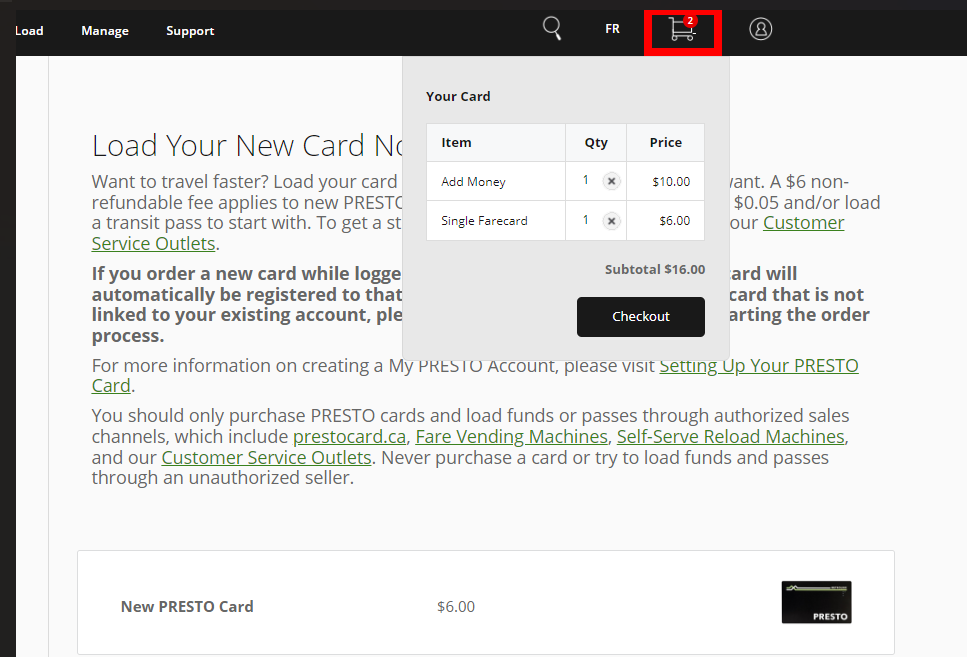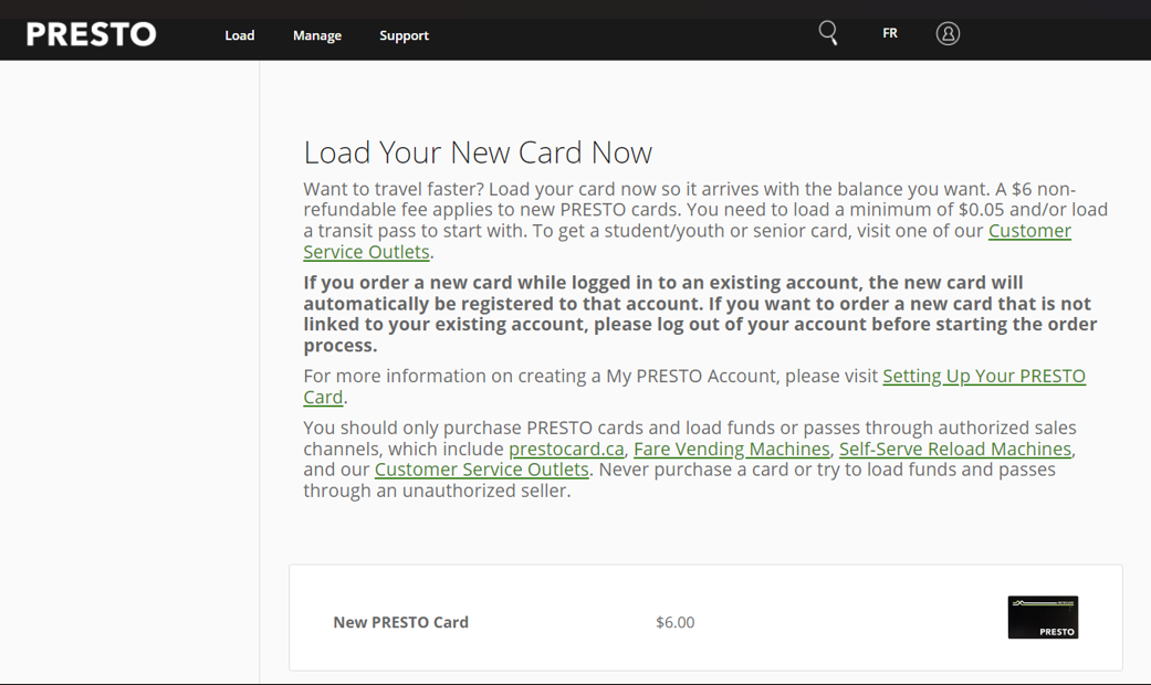 1. 먼저 Presto card 온라인 사이트에 방문합니다. (https://www.prestocard.ca/en)