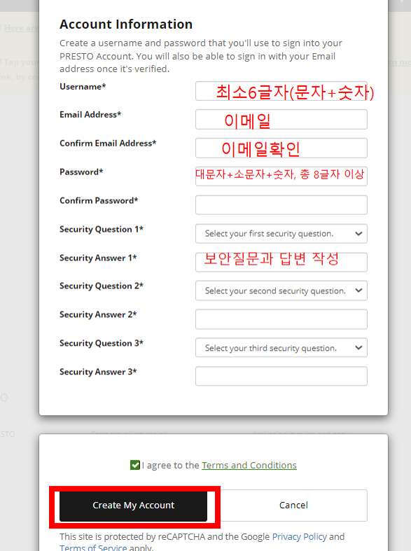 - username, 보안질문도 작성합니다. username은 사이트 로그인할 때 필요한 ID에요.