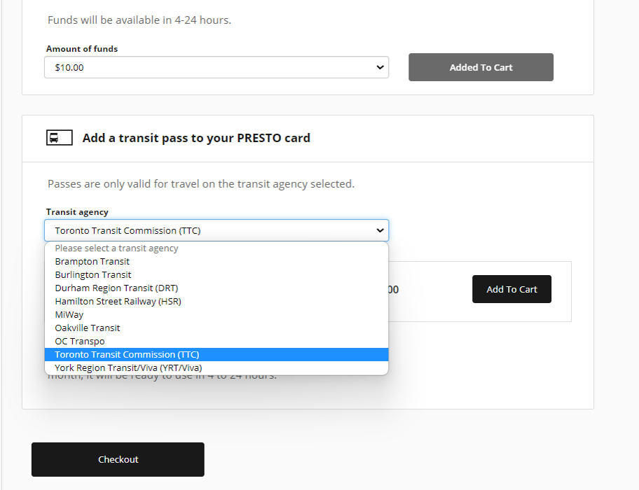 - 교통카드 발급비용은 6불이에요. 교통카드 발급 시 미리 충전할 선불 금액을 선택해요. 그러고 나서 지역 교통수단 선택란이 있는데 토론토 대중교통을 이용할 거라 TTC 선택합니다.