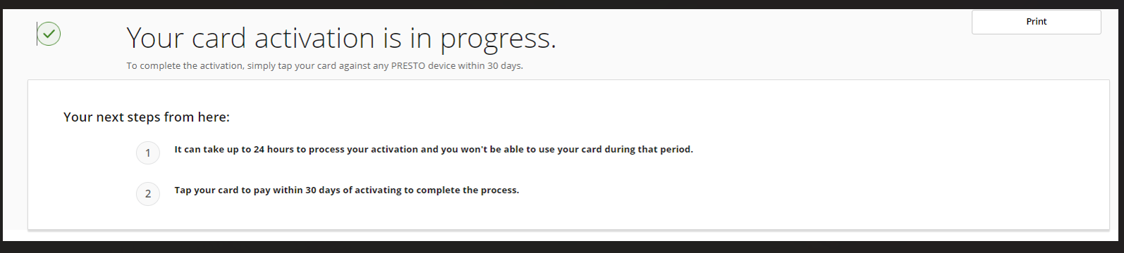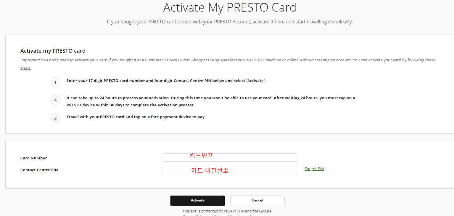 로그인하고 나면 Activate 버튼이 보이는데 클릭하면 Activate My presto Card가 화면이 나옵니다. 카드 뒷편에 17자리 숫자와 카드비밀번호를 작성후 Activate 진행합니다.