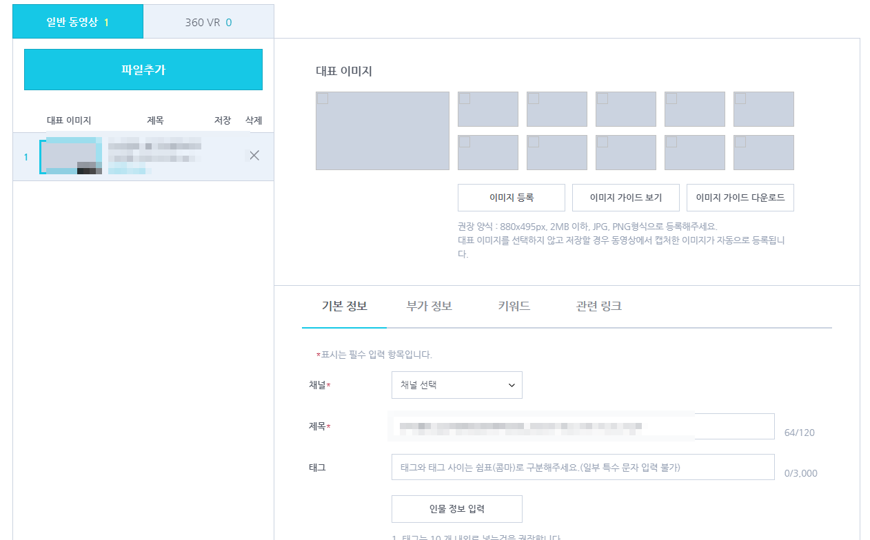 업로드 시 아래와 같이 왼쪽 상단에 영상 업로드 현황이 나오고 대표 썸네일과 채널의 기본정보를 입력하는 란이 나옵니다. 차근차근 작성합니다.