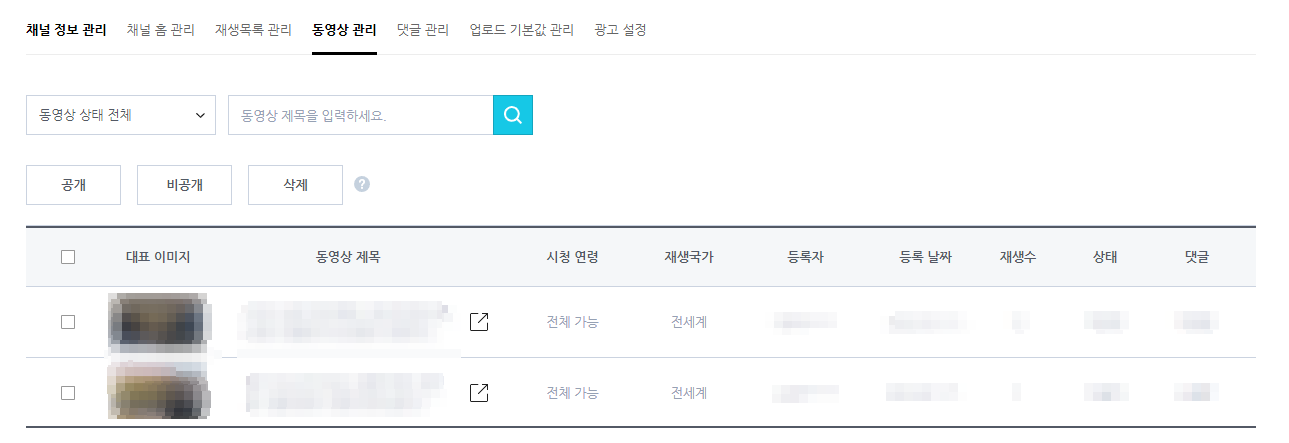 채널관리 - 업로드 이력을 클릭하면 본인이 업로드한 영상내역을 볼수 있습니다.