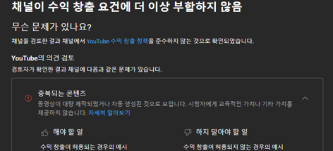 안녕하세요. 오늘은 유튜브운영하다 갑작스럽게 수익정지가 되는 사유와 해결 방법에 대해 알려드리겠습니다. 4000시간, 구독자 1000명에 대한 수익조건을 달성 후 위기가 찾아오게 됩니다. 특히 중복 콘텐츠, 재사용 콘텐츠에 대한 항목으로 수익정지를 받게 되면 어떤 영상이 문제가 있는지 알려주기 않기 때문에 답답합니다. 저 같은 경우는 중복 콘텐츠로 인한 수익정지를 받았고 하루 만에 항소영상으로 해결했습니다. 물론 항소영상 제작은 굉장히 노력이 요하는 작업으로 이것만 집중하는데 하루정도 걸렸습니다. 물론 돈과 관련된 것이기에 하루라도 빠르게 항소를 진행하는 것이 좋고, 채널의 노출도 악영향을 주기에 이런 것은 빠르게 대응하는 게 좋다고 들었습니다.