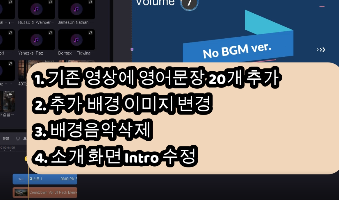 - 앞에서 준비한 비디오 제작화면, 음악과 이미지 사용출처등 영상에 소개합니다.