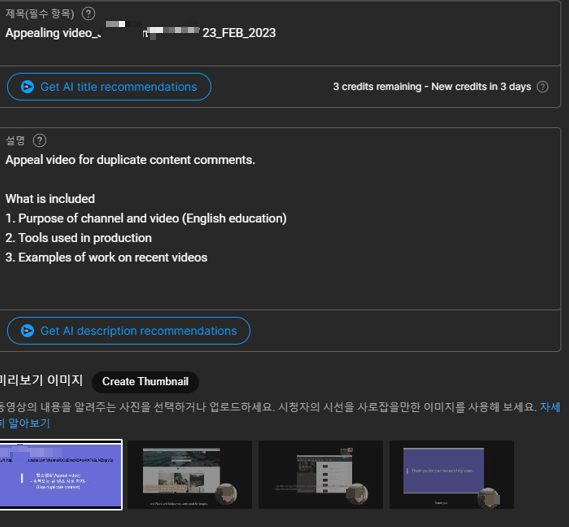 아마도 최근에 올린 영상중 썸네일이 비슷하고 기존 영상에서 일부 내용만 변경한 영상이 문제가 된 것 같았어요. 여기서 선택은 두 가지, 문제가 될 만한 영상을 모두 지우고 30일 후 재검토 신청, 다른 하나는 15일이내 항소영상을 보내고 재검토를 받는 것입니다. 저는 여기서 항소영상을 만들어 보기로 하였습니다.