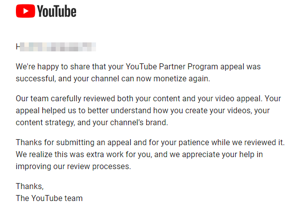 항소제출을 당일 저녁때 제출하고 나서 다음날 아침 일어나 보니 항소가 받아졌고 수익승인 다시 가능하게 되었다고 이메일을 받았습니다. 아마도 제출한 지 한 6시간 정도만에 항소가 받아졌습니다 ^^. 유튜브 운영진들 정말로 열일하는 것 같습니다.