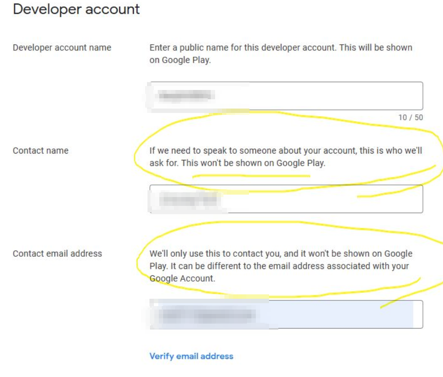 6. 개발자 계정에 대한 정보를 작성한다. 개발자 계정이름과 소유자 이름, 이메일 주소, 전화번호를 기입한다. 실제로 구글play에서 연락할수 있는 정보를 기입하는 것으로 본인 것을 작성하면 된다.