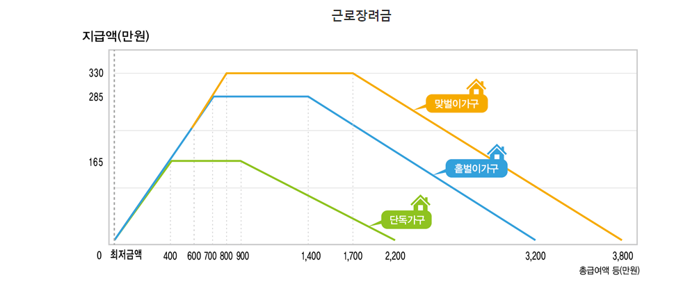 근로장려금 | 2,200만원 미만 | 3,200만원 미만 | 3,800만원 미만 |